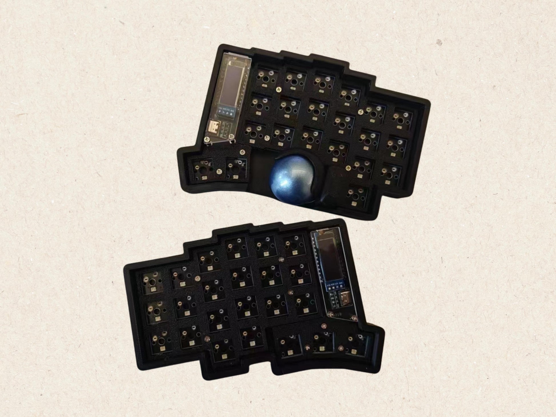 Trackball works unexpectedly well, pretty happy with the purchase! (59 key layout with dual rotary encoders, MX support for thumb area, black case, light blue trackball).